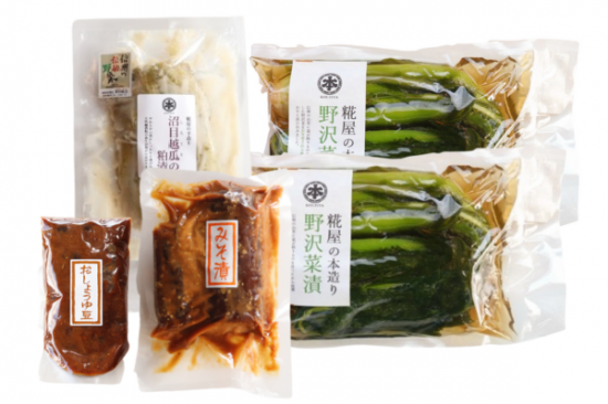■原材料:野沢菜漬「野沢菜(信州産)、食塩、醤油、砂糖、食酢」 みそ漬「だいこん(国内産)、味噌」 沼目越瓜の粕漬「白瓜(長野県須坂市産)、大吟醸酒粕、砂糖、食塩」 おしょうゆ豆「黒豆(北海道産)、醤油、みりん、小麦」